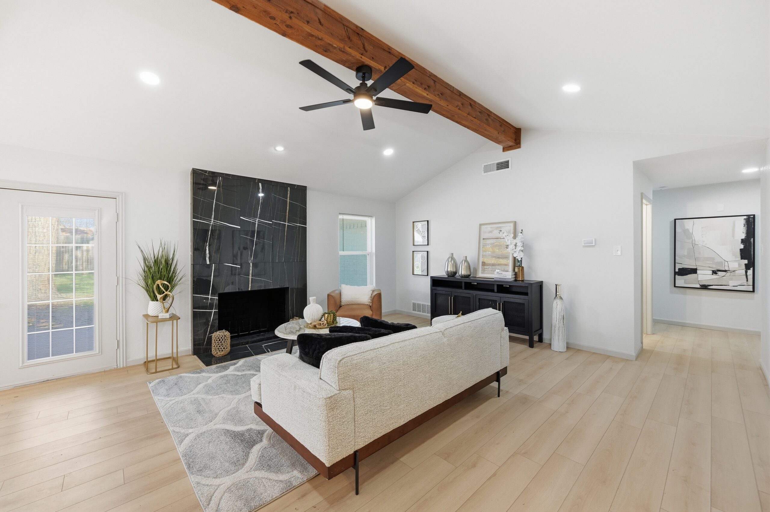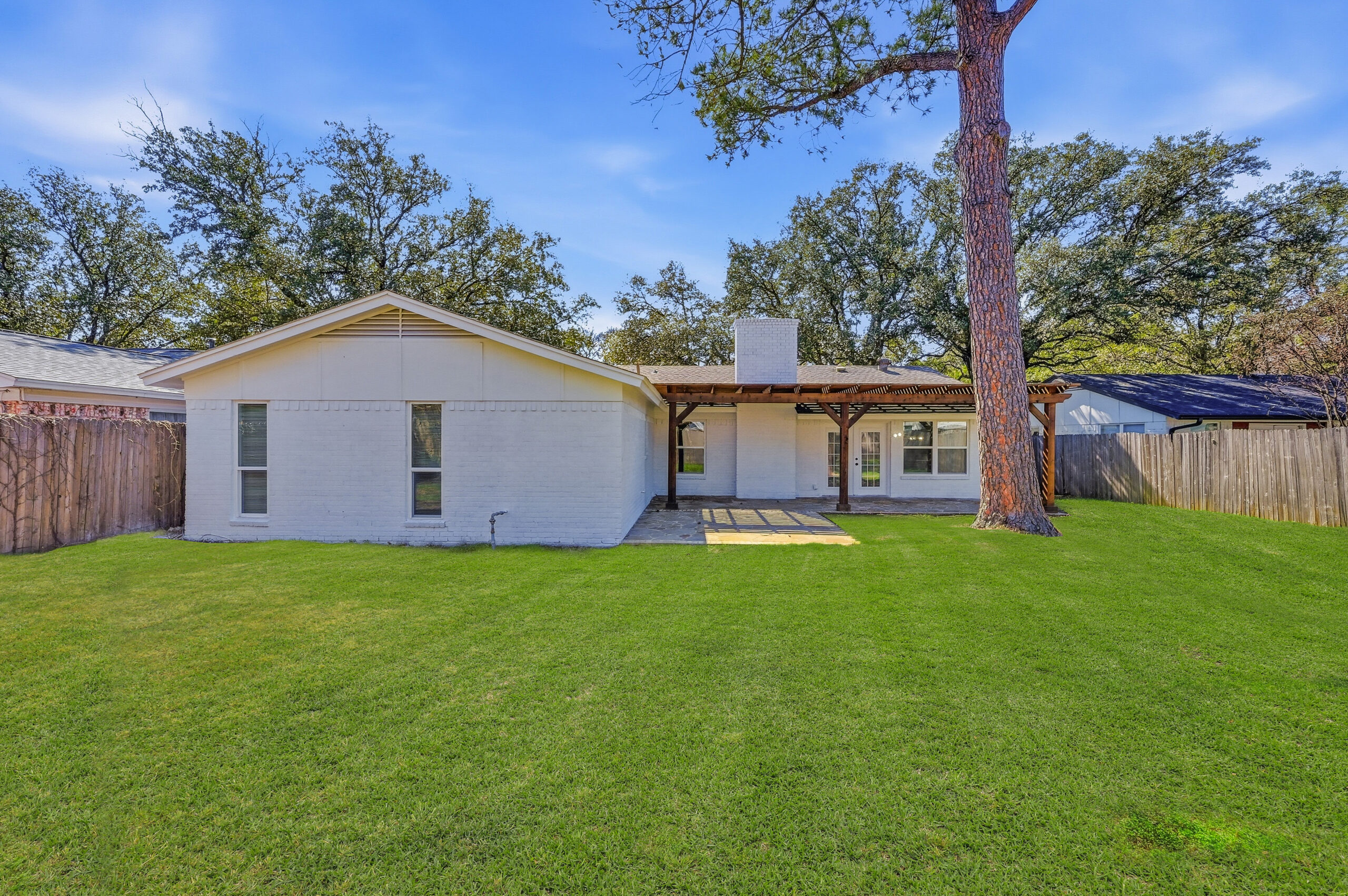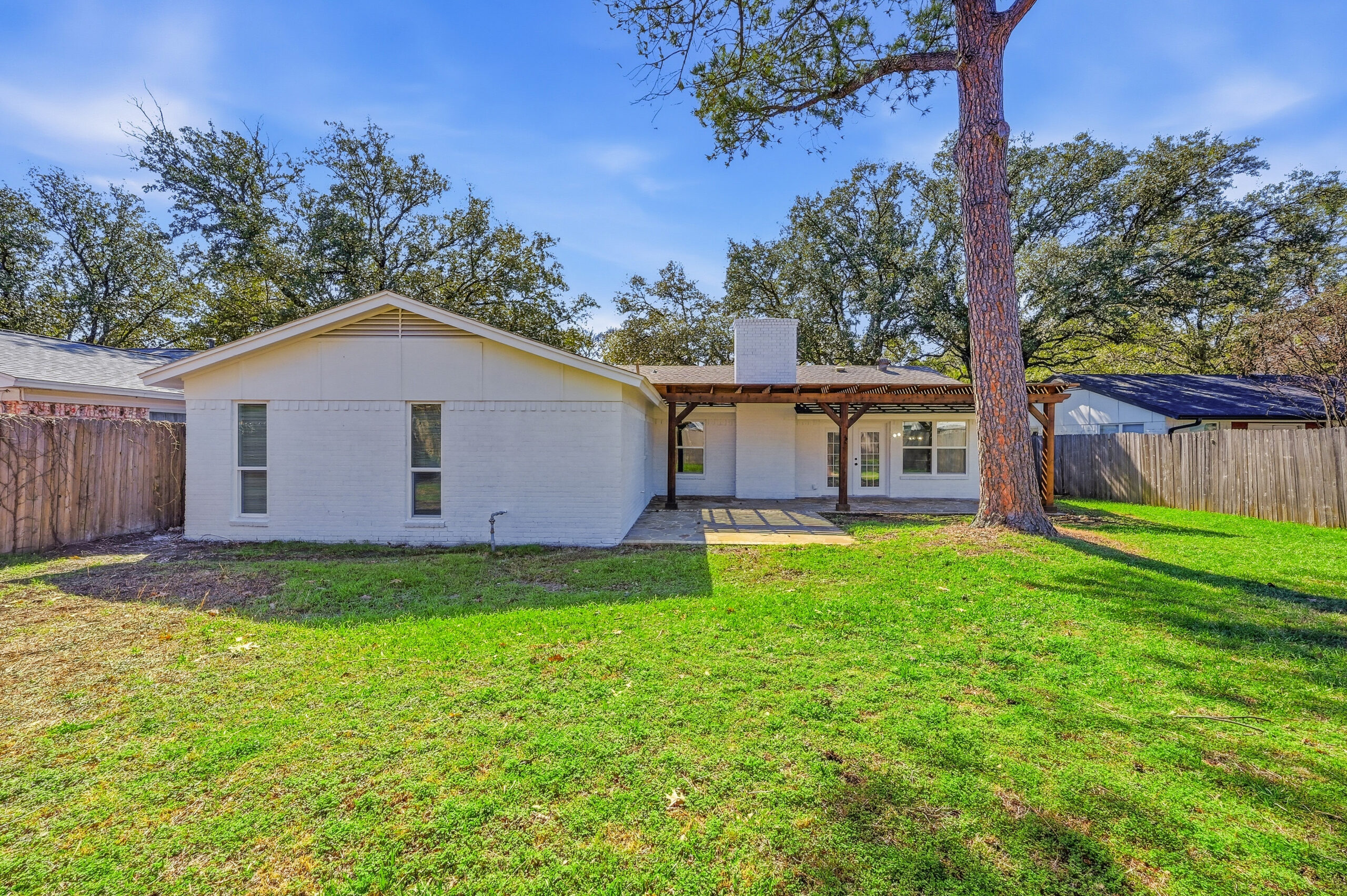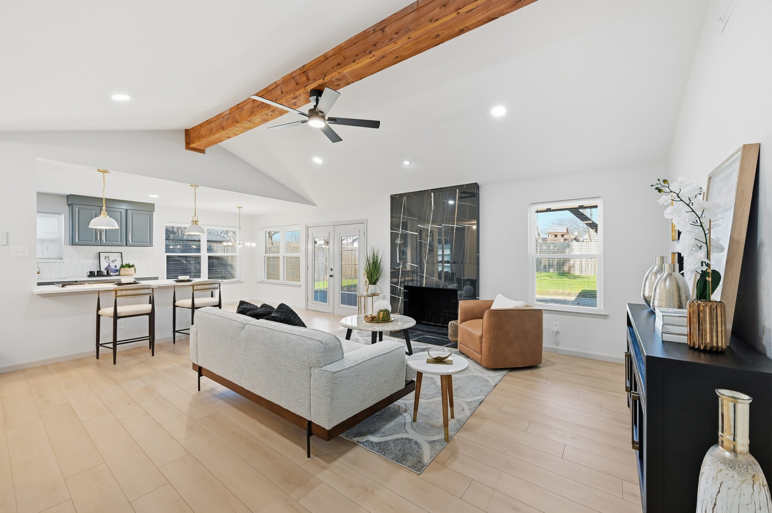 Welcome home to the perfect blend of luxury and comfort in this beautifully updated residence. This stunning home offers four bedrooms, two bathrooms, a formal dining area, and exceptional curb appeal enhanced by mature, established trees. Recent upgrades include fresh interior and exterior paint, new doors, stylish light fixtures, and updated flooring throughout, along with completely redesigned kitchen and bathrooms. Upon entry, you are greeted by an inviting living space featuring vaulted ceilings with a cedar beam, recessed lighting, and a striking modern fireplace. The thoughtfully designed kitchen is ideal for both everyday living and entertaining, showcasing new stainless steel appliances, granite countertops, refinished cabinetry with elegant gold hardware, and a contemporary backsplash. The spacious primary suite offers a walk-in closet and a luxurious en-suite bathroom, highlighted by an oversized walk-in shower with dual shower heads and a sleek floating vanity. Outdoors, the fully fenced backyard provides privacy and a large covered patio—perfect for relaxing or hosting guests. This exceptional home offers comfort, style, and functionality in every detail. This isn’t one you’ll want to miss!