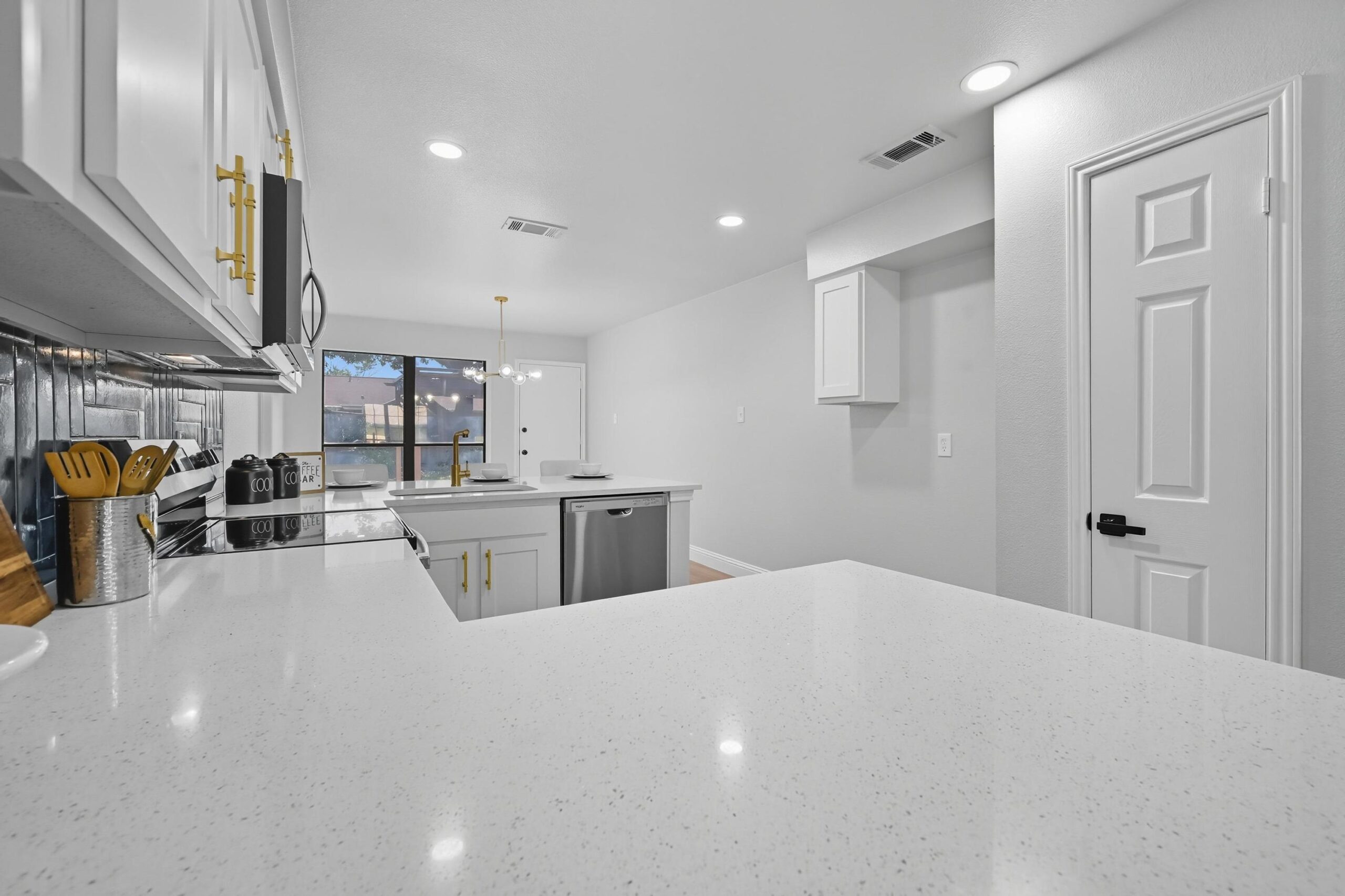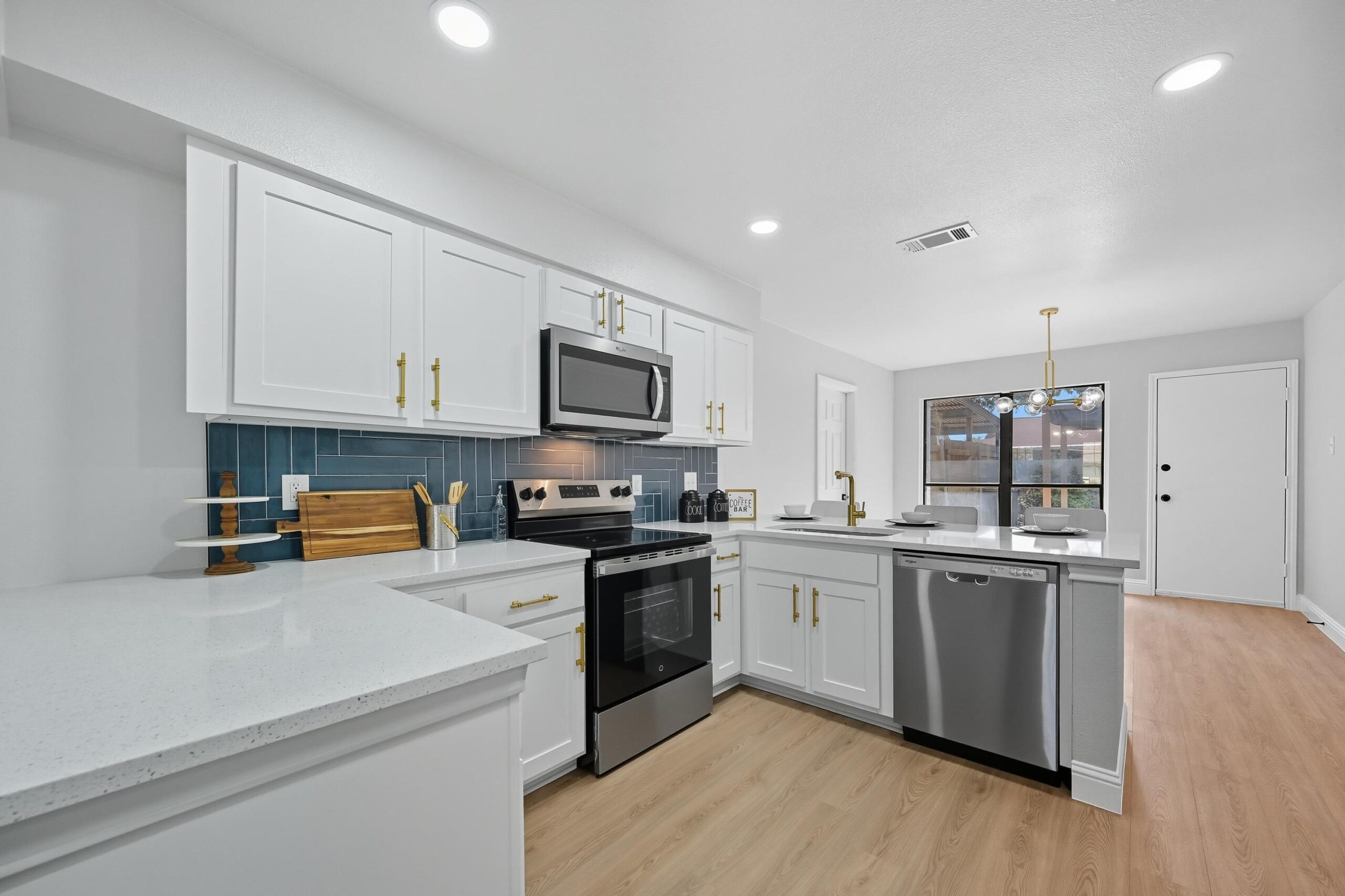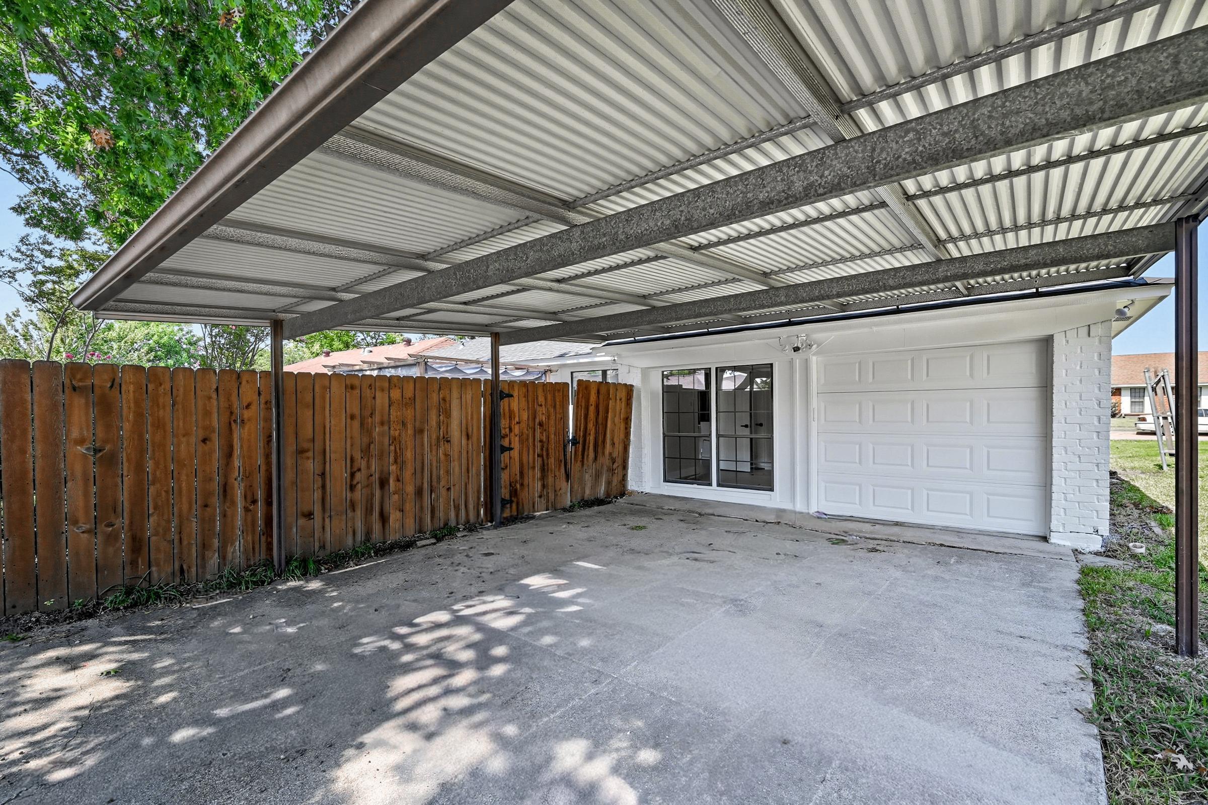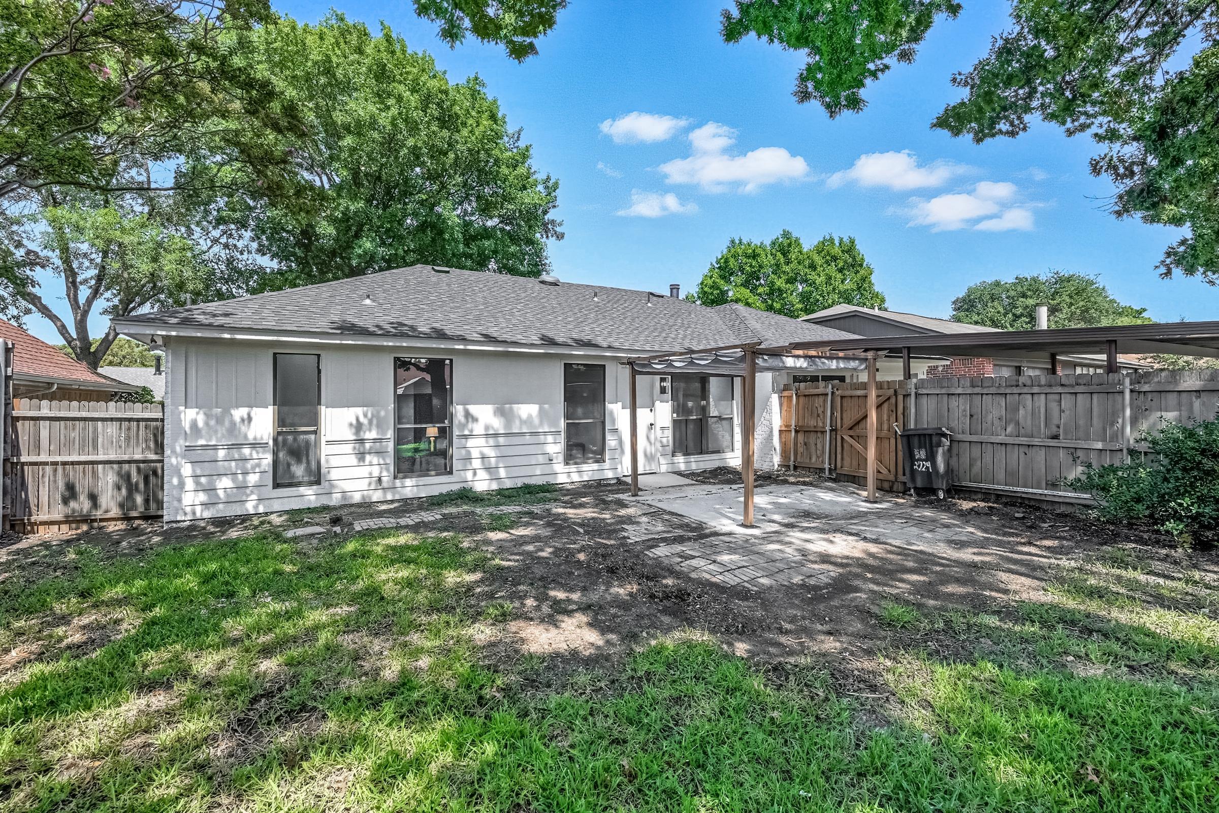 Welcome to this beautifully renovated 4 bed, 2 bath home! The floor plan is open and bright with a semi-formal dining area, breakfast nook, and 4th bedroom that could also be used as an office. Updates include brand new roof, interior and exterior paint, doors, light fixtures, flooring and completely reimagined kitchen and bathrooms. Those who like to cook and entertain will fall in love with the new stainless steel appliances, Calcutta quartz countertops, and shaker cabinet doors in the kitchen. The primary bedroom is a great size with a walk in closet and a gorgeous modern walk in shower. Once outside you are welcomed by a large patio with a new pergola-perfect for grilling out in fall weather! The back yard is fenced for privacy and an alley drive leads to covered parking for 3. Located just minutes from highway 635 making travel a breeze. This is one you won’t want to miss!