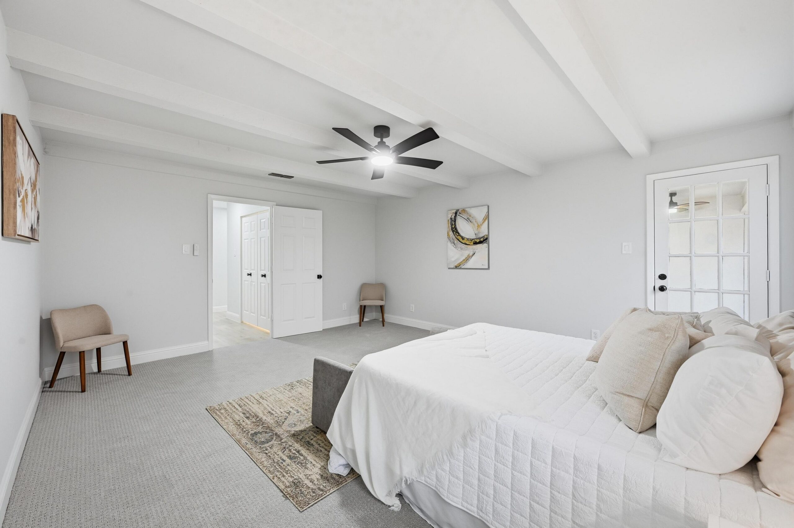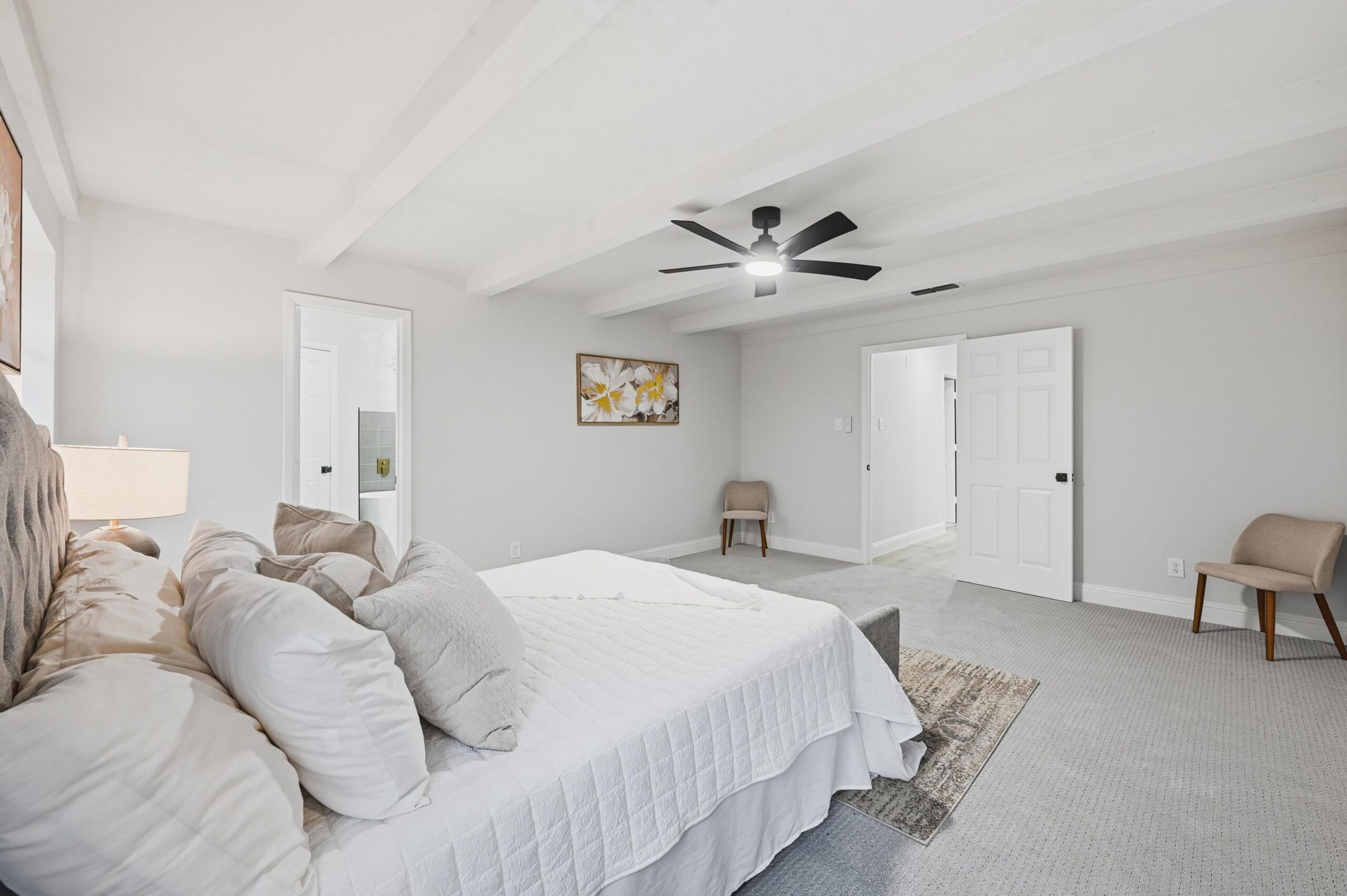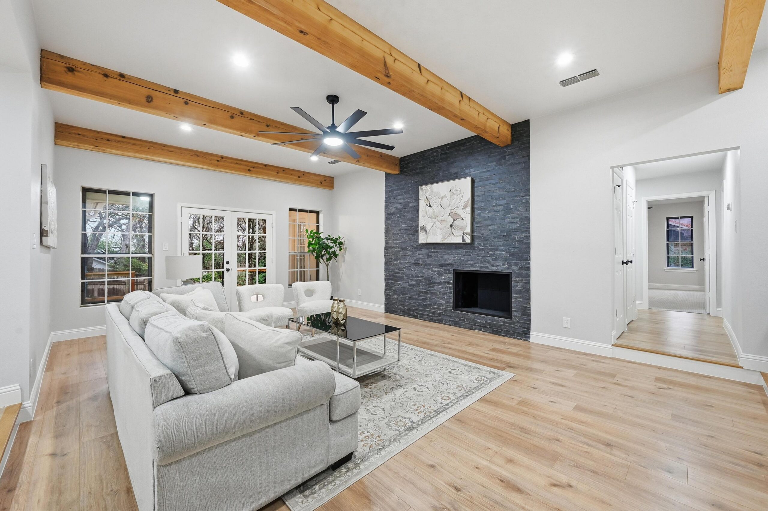 Thoughtfully updated, the home boasts a new roof, designer lighting, new flooring, upgraded doors, and a fully reimagined kitchen and baths. Inside, you’re welcomed by a dramatic floor-to-ceiling fireplace complemented by warm, exposed wood beams that create an inviting yet refined living space. The private office, located just off the main living area, provides flexibility for work, study, or a cozy retreat.