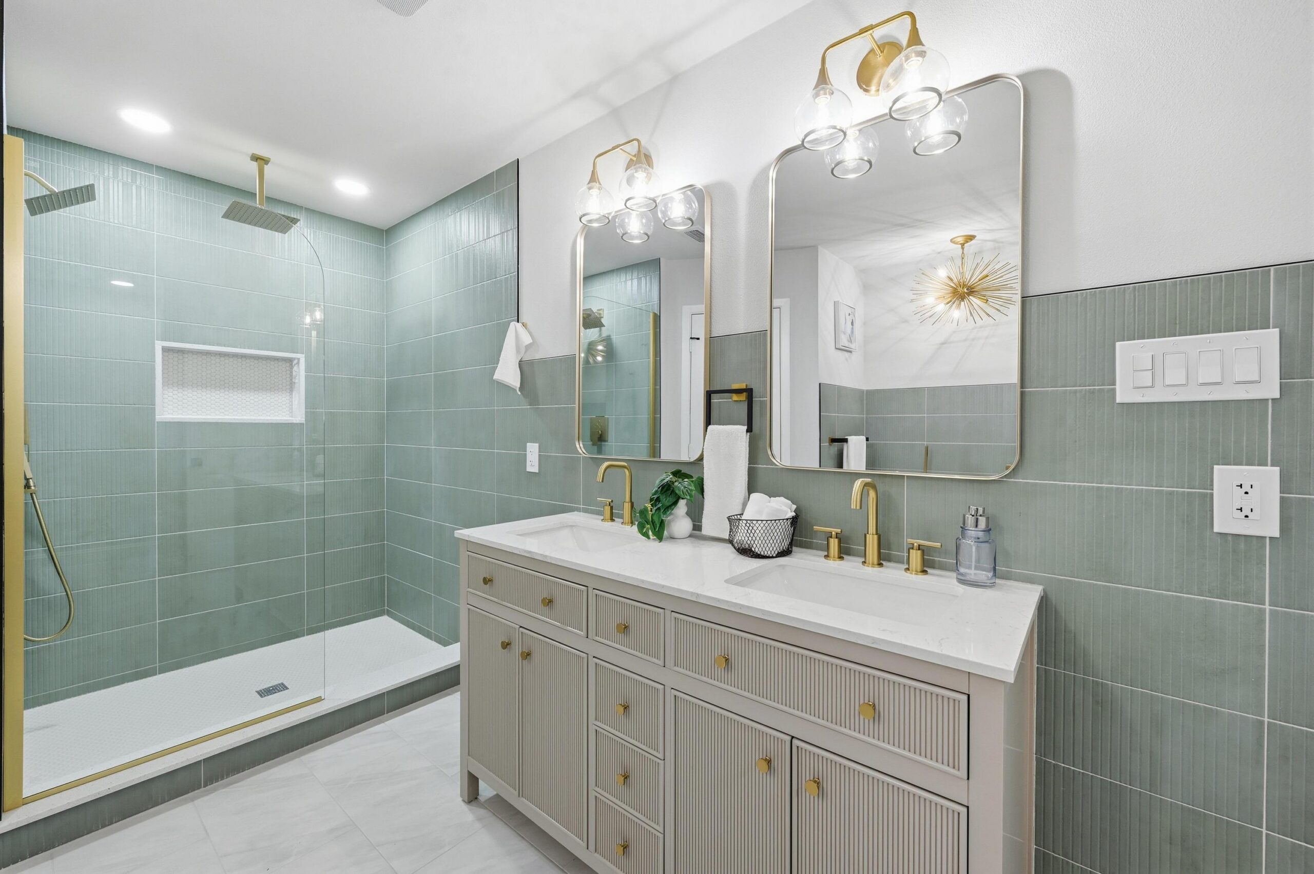 The kitchen is a true showpiece, designed for both everyday living and entertaining, with quartz countertops, custom cabinetry, and sleek stainless steel appliances. The dining area is bathed in natural light, accented by a modern chandelier and expansive windows overlooking the front grounds.